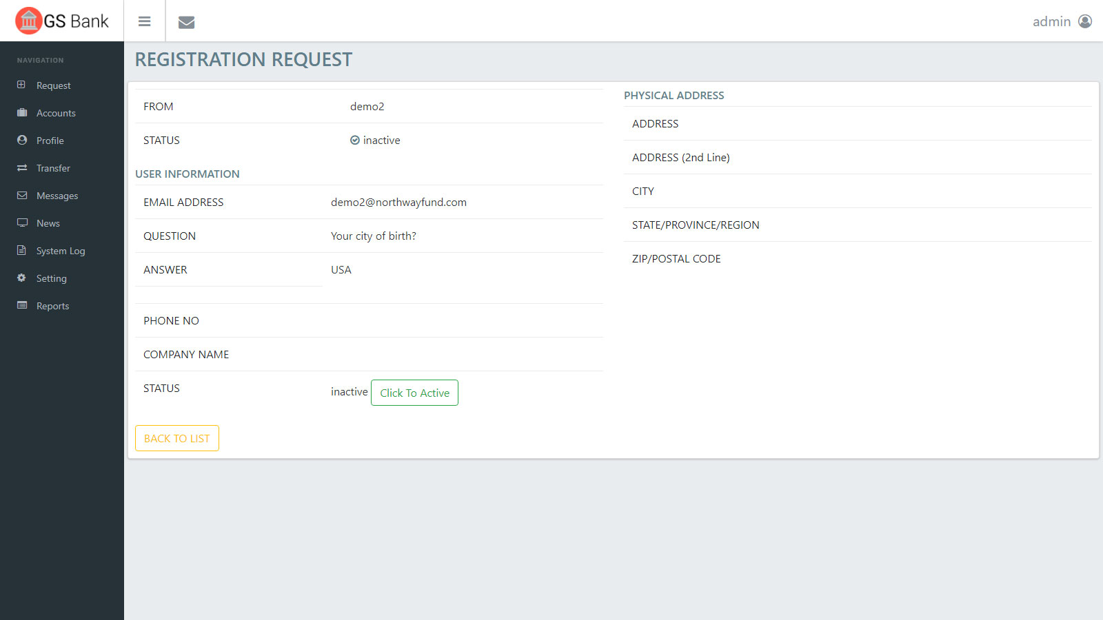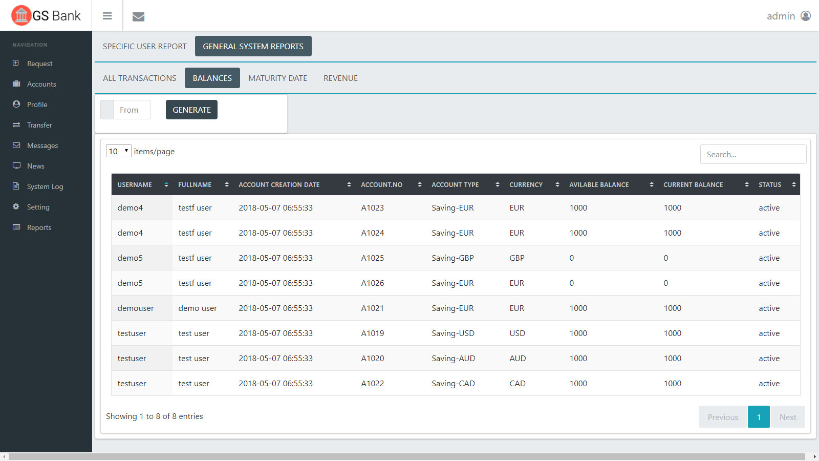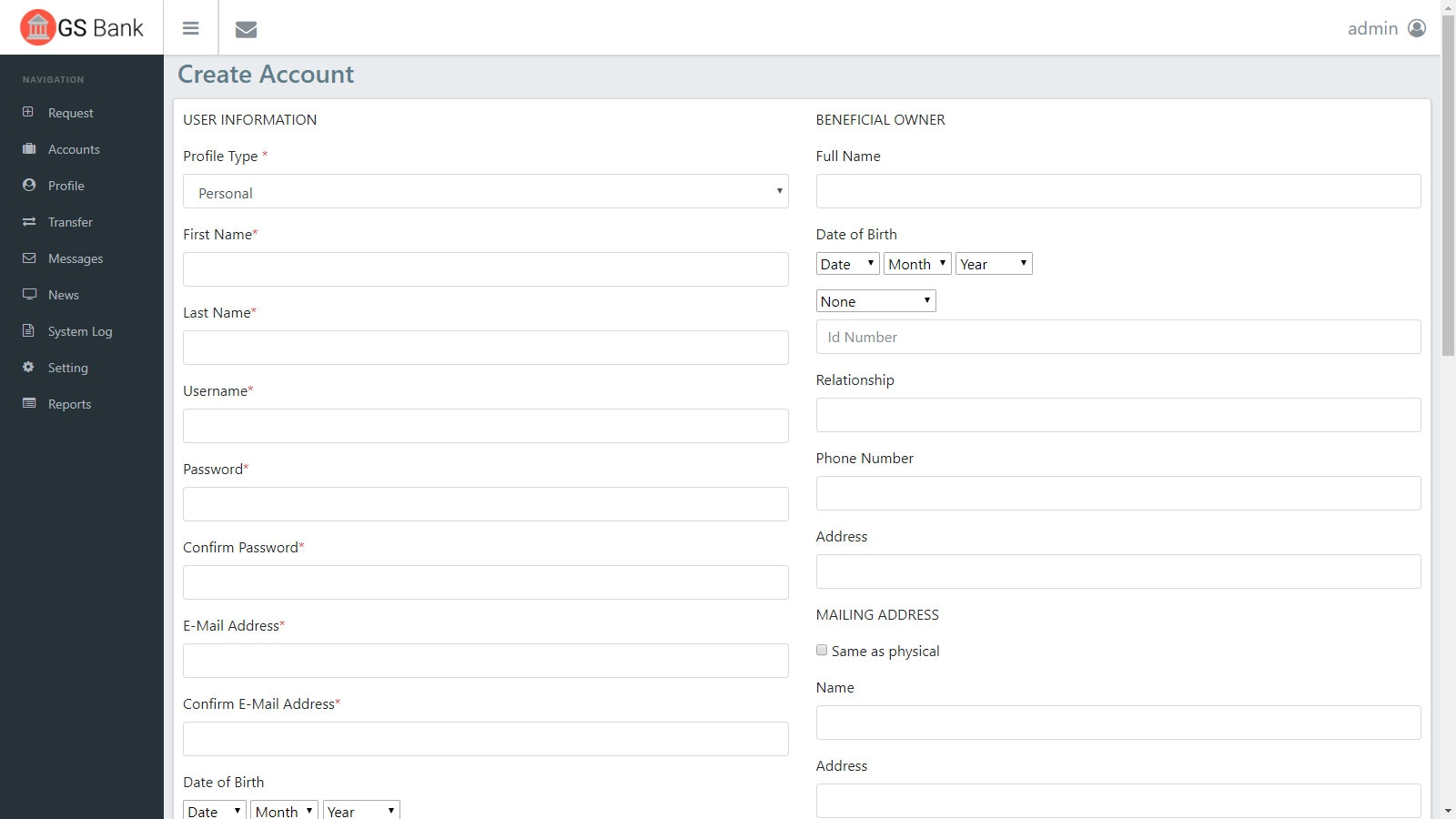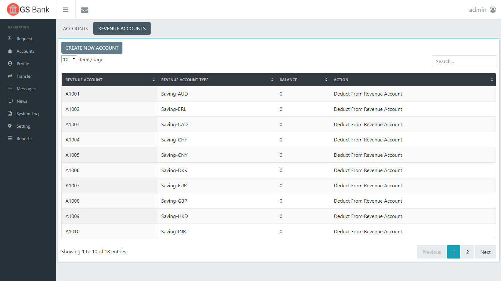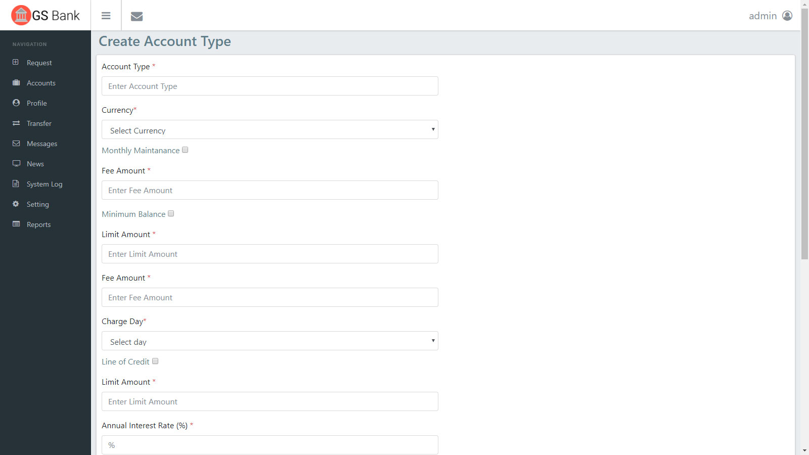 By using this GS Bank software the admin can easily create multiple account types. The admin can select account type and fill in the details with regard to relative countries, type of currencies, setting up the initial balance, status, term deposit, interests, and Pay-out.