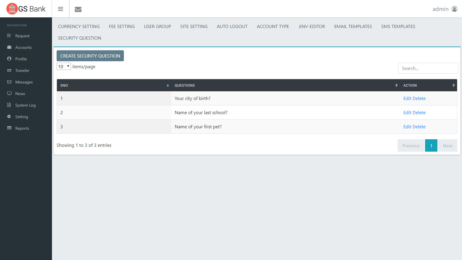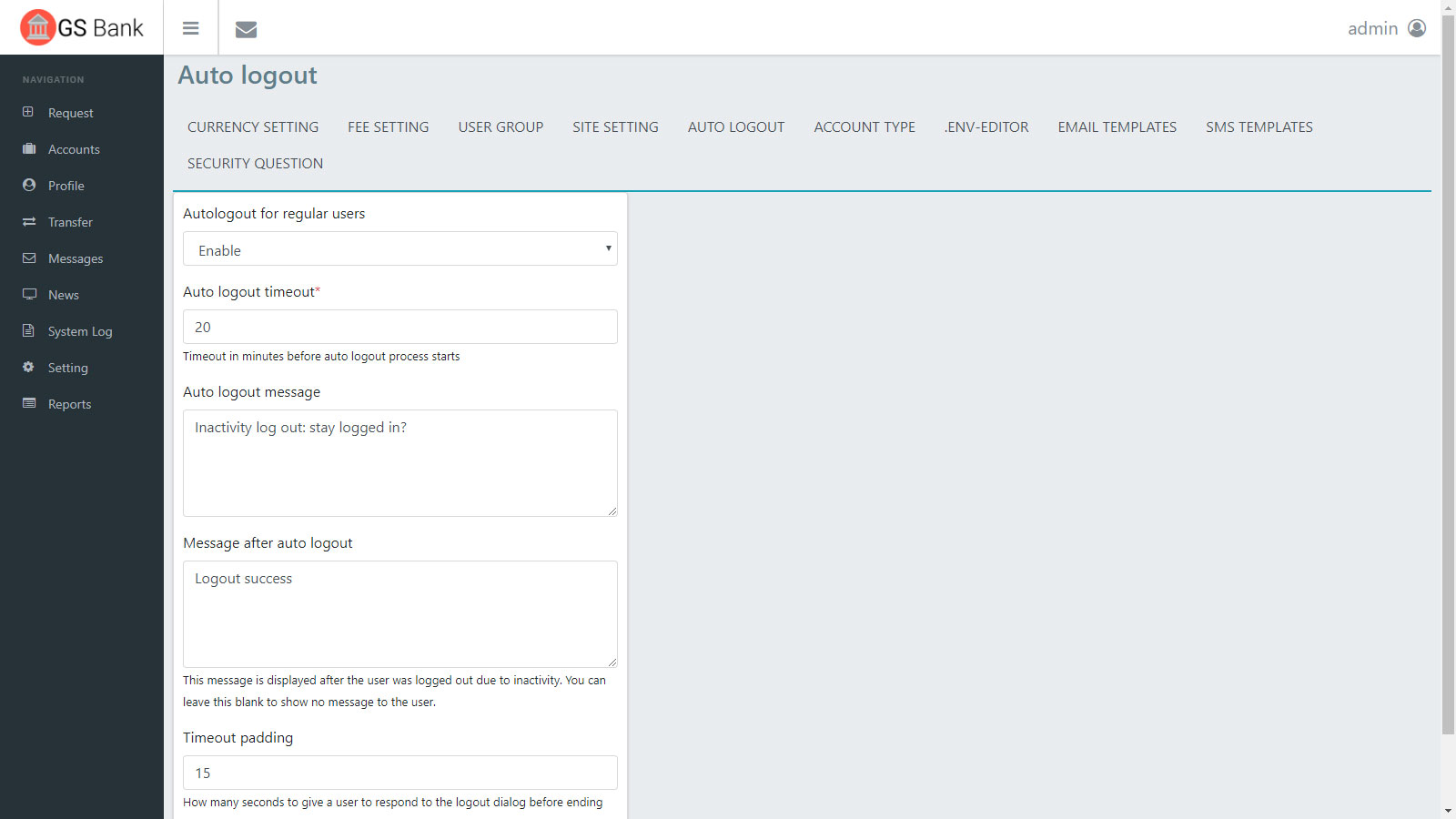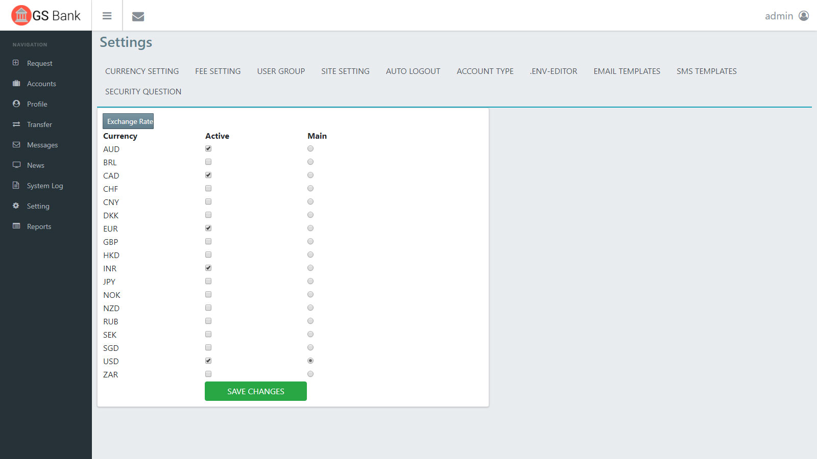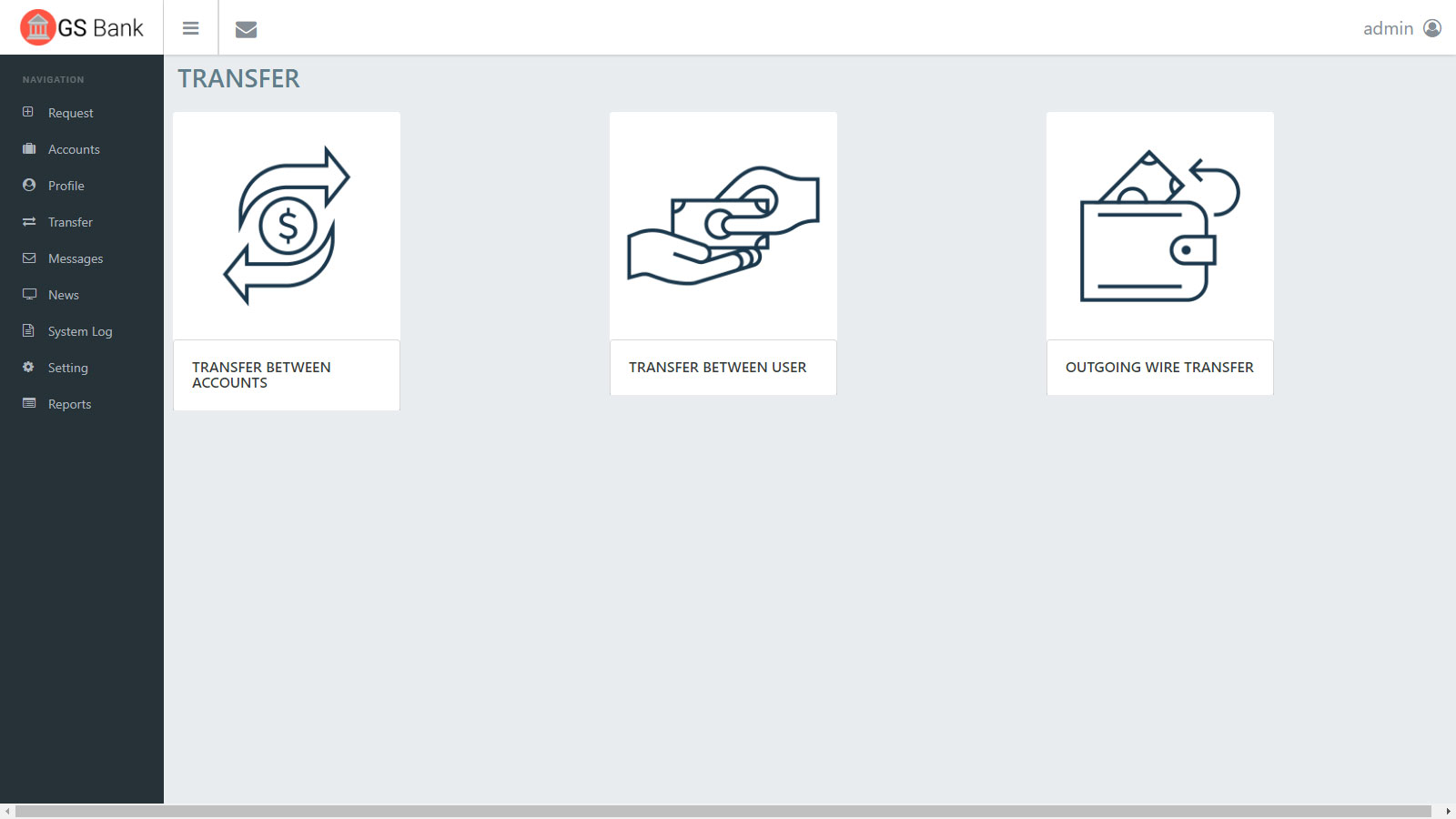 - This GS banking software helps the admin to set up the Fee Settings for three account categories namely Internal Fee Setting, User Fee Setting and Wire Transfer Setting.