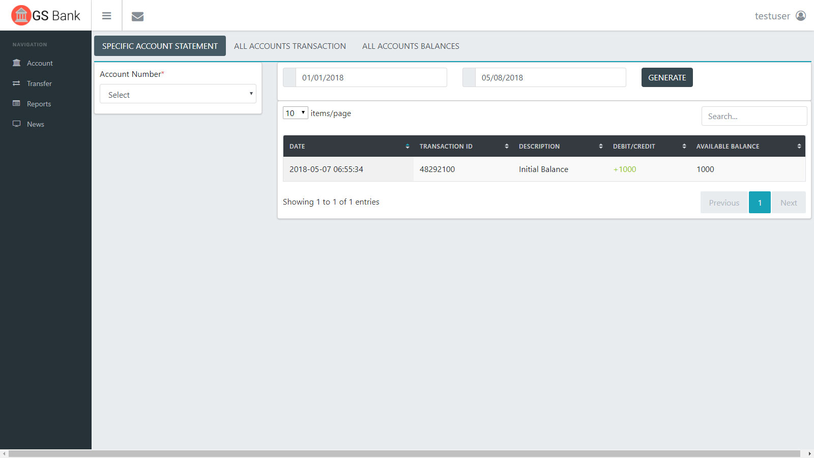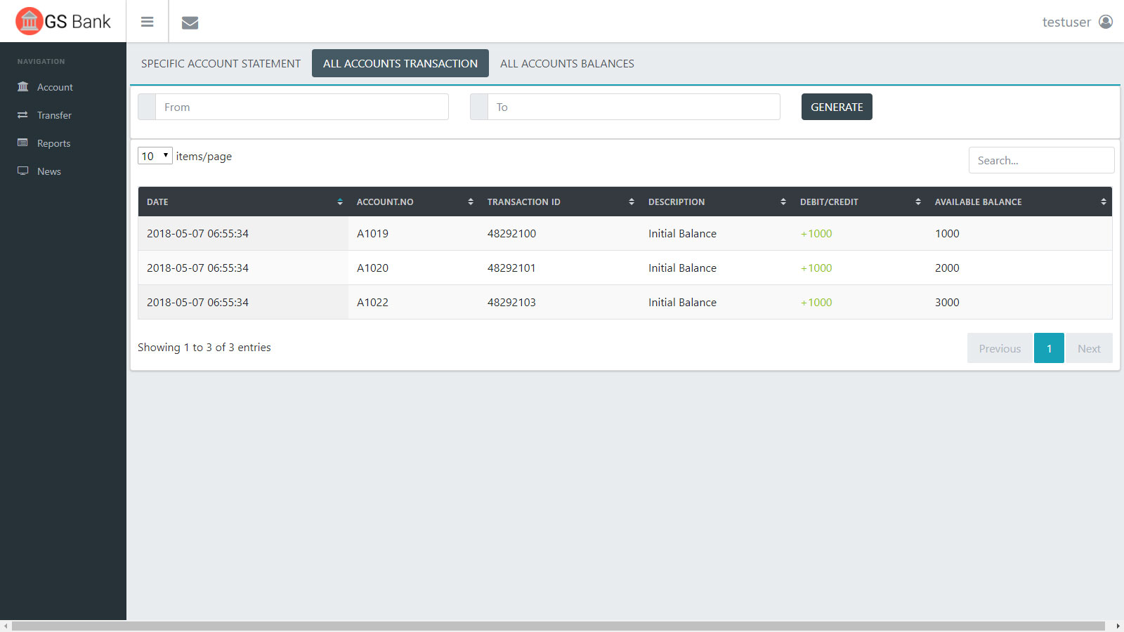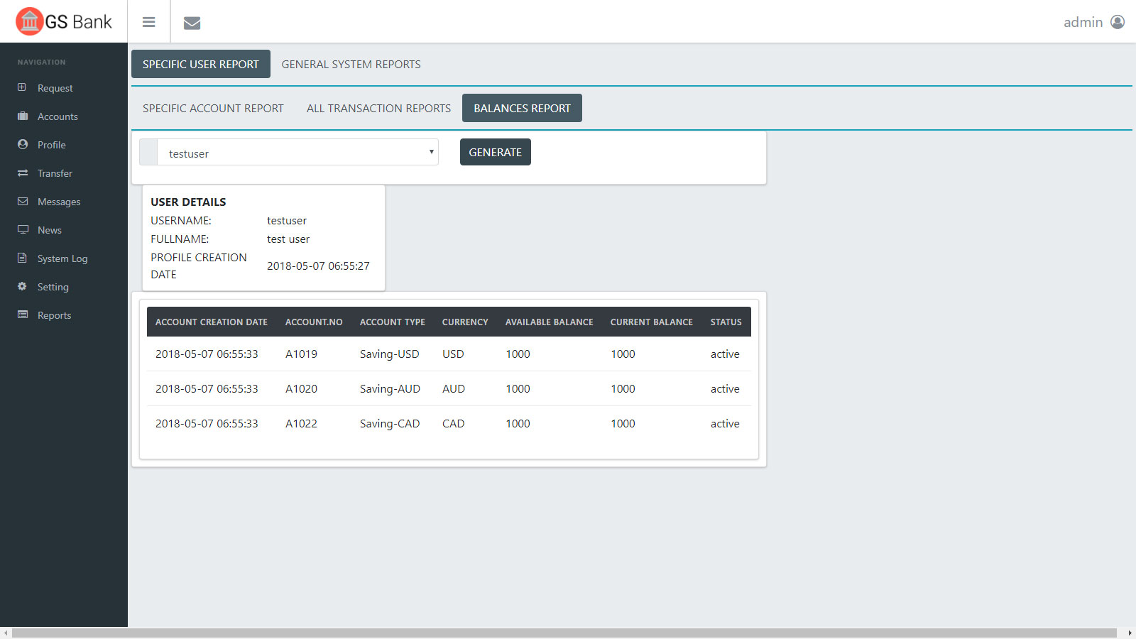 - Reports can be generated on User Specific, Account Type Specific and Transaction Type Specific.