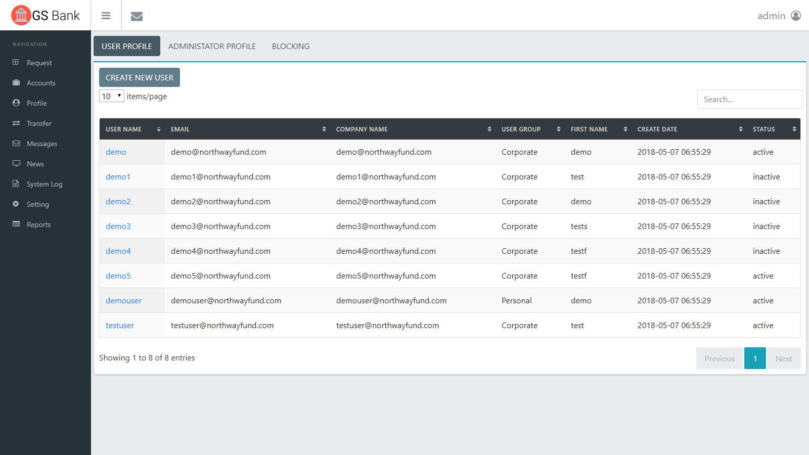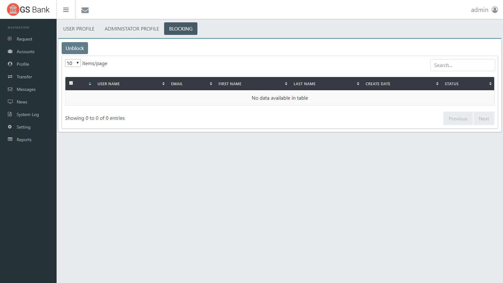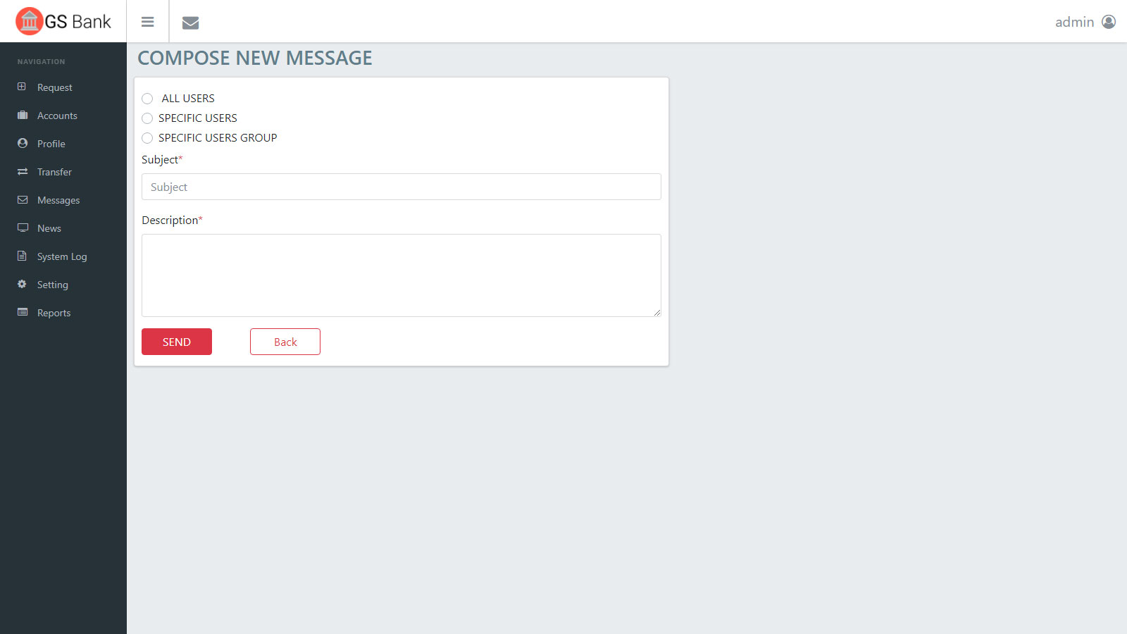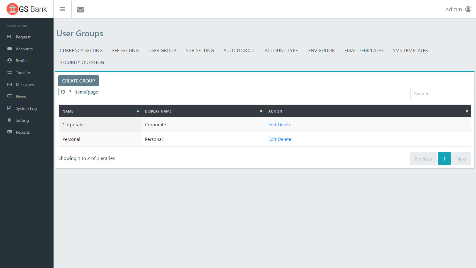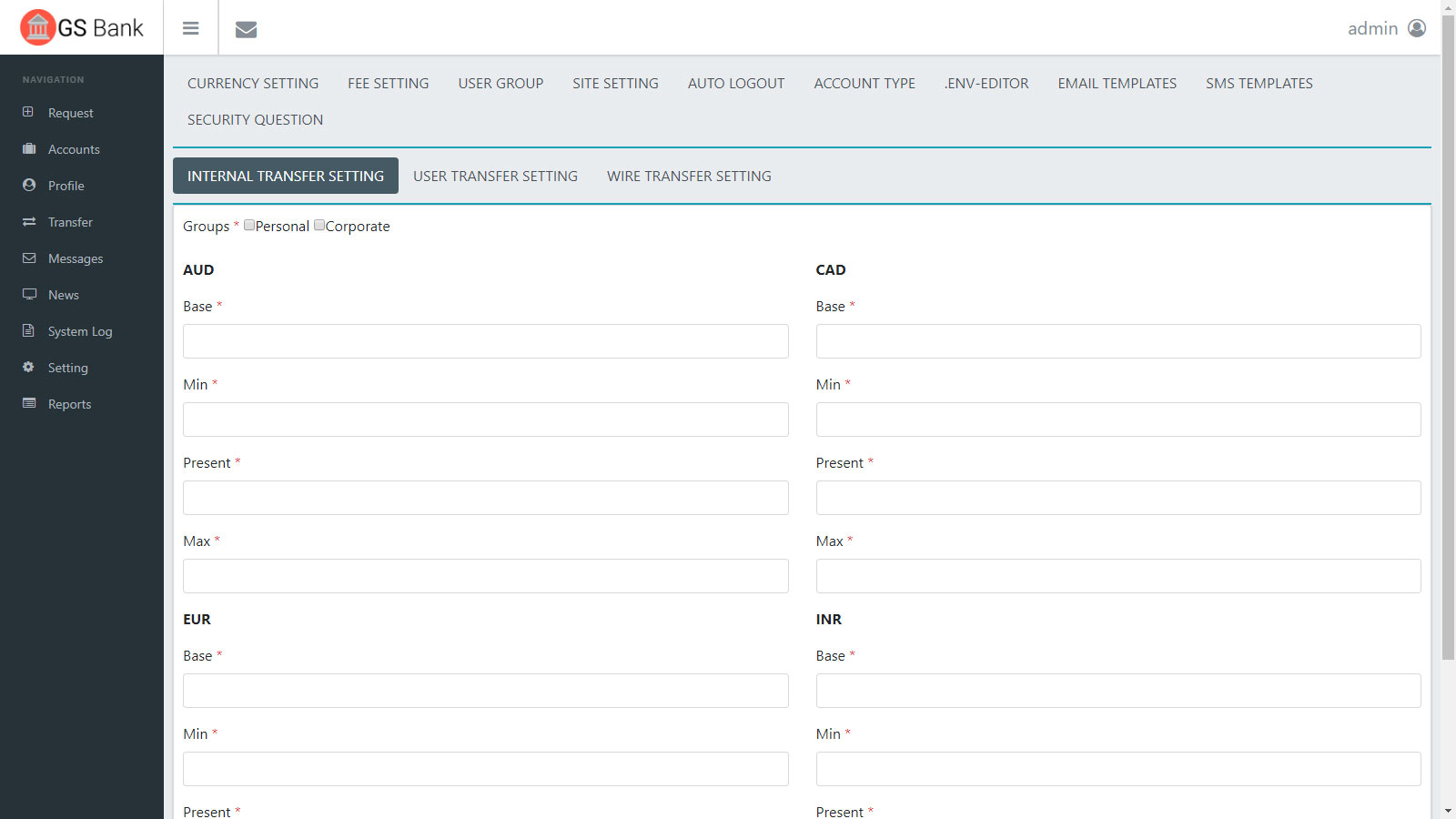 - This GS banking software helps the admin to set up the Fee Settings for three account categories namely Internal Fee Setting, User Fee Setting and Wire Transfer Setting.