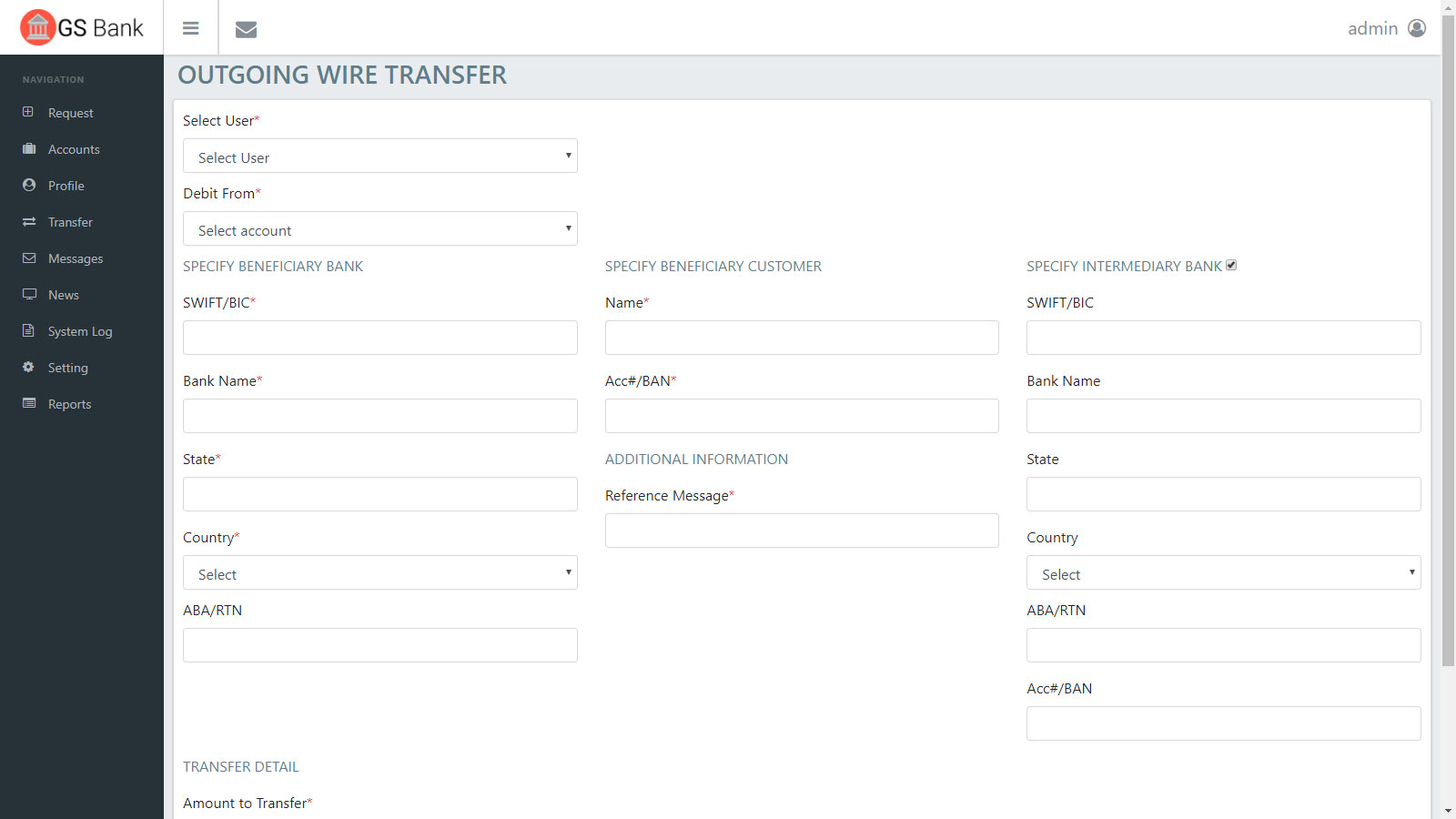 - The admin can use this feature of Outgoing Wire Transfer for transferring any fund amount to different banks.