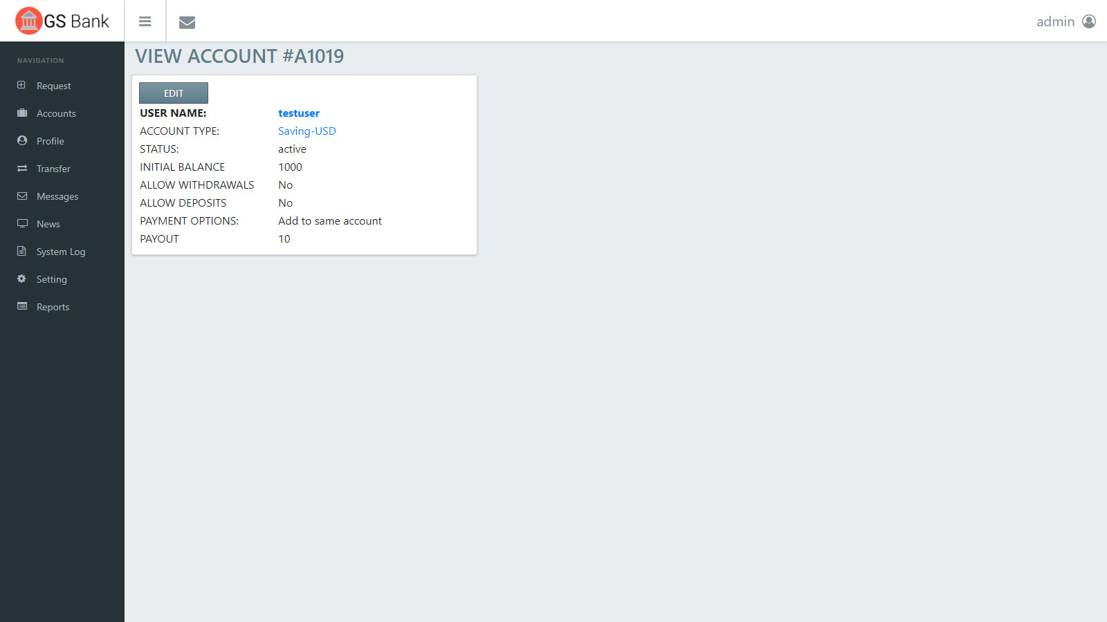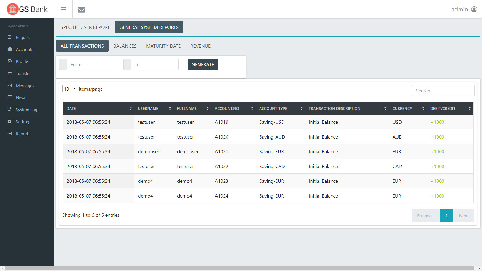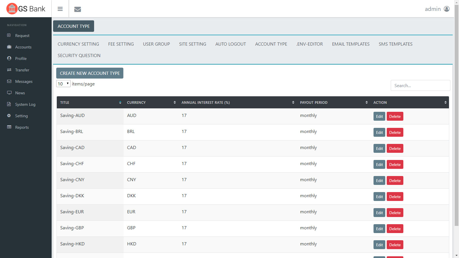 By using this GS Bank software the admin can easily create multiple account types. The admin can select account type and fill in the details with regard to relative countries, type of currencies, setting up the initial balance, status, term deposit, interests, and Pay-out.