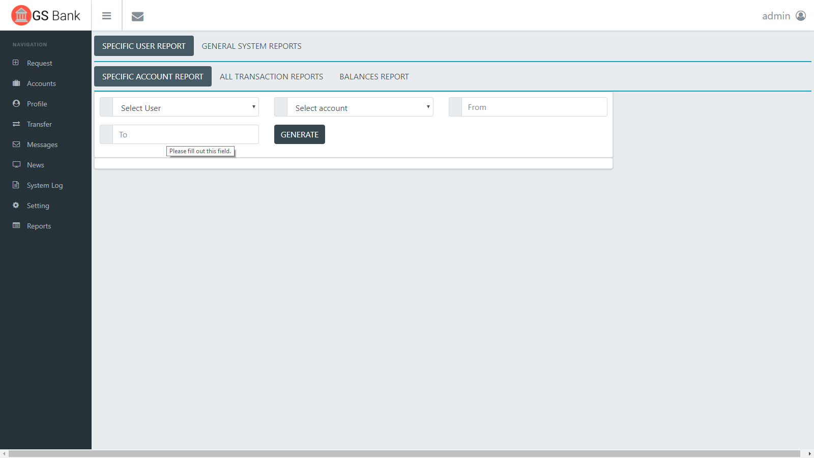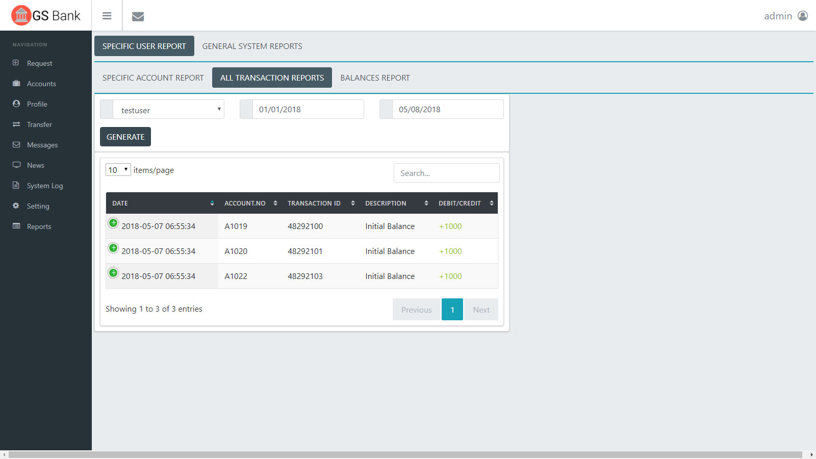 - Reports can be generated on User Specific, Account Type Specific and Transaction Type Specific.