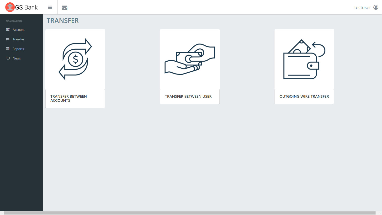 The users also have a Transfer section where one could Transfer amounts between Accounts, Transfer between Users, and Outgoing Wire Transfers. There is also a special category termed Reports.