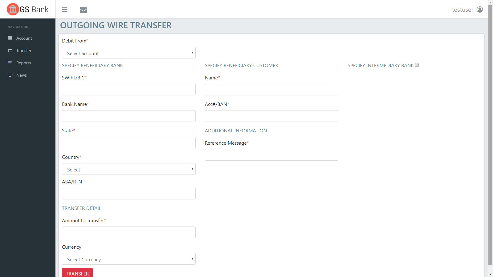 - The admin can click Transfer option and then select user, click Specify beneficiary bank, fill up Specify beneficiary customerand also Specify intermediary bank if any, fill up transfer detail and click button to Transfer.